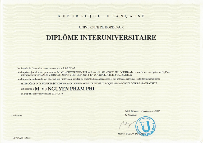 - Diplome InterUniversitaire về “Phẫu thuật miệng và nha chu” của Đại Học Bordeaux Segalen, Pháp – Đại Học Y Dược TP. HCM năm 2018.